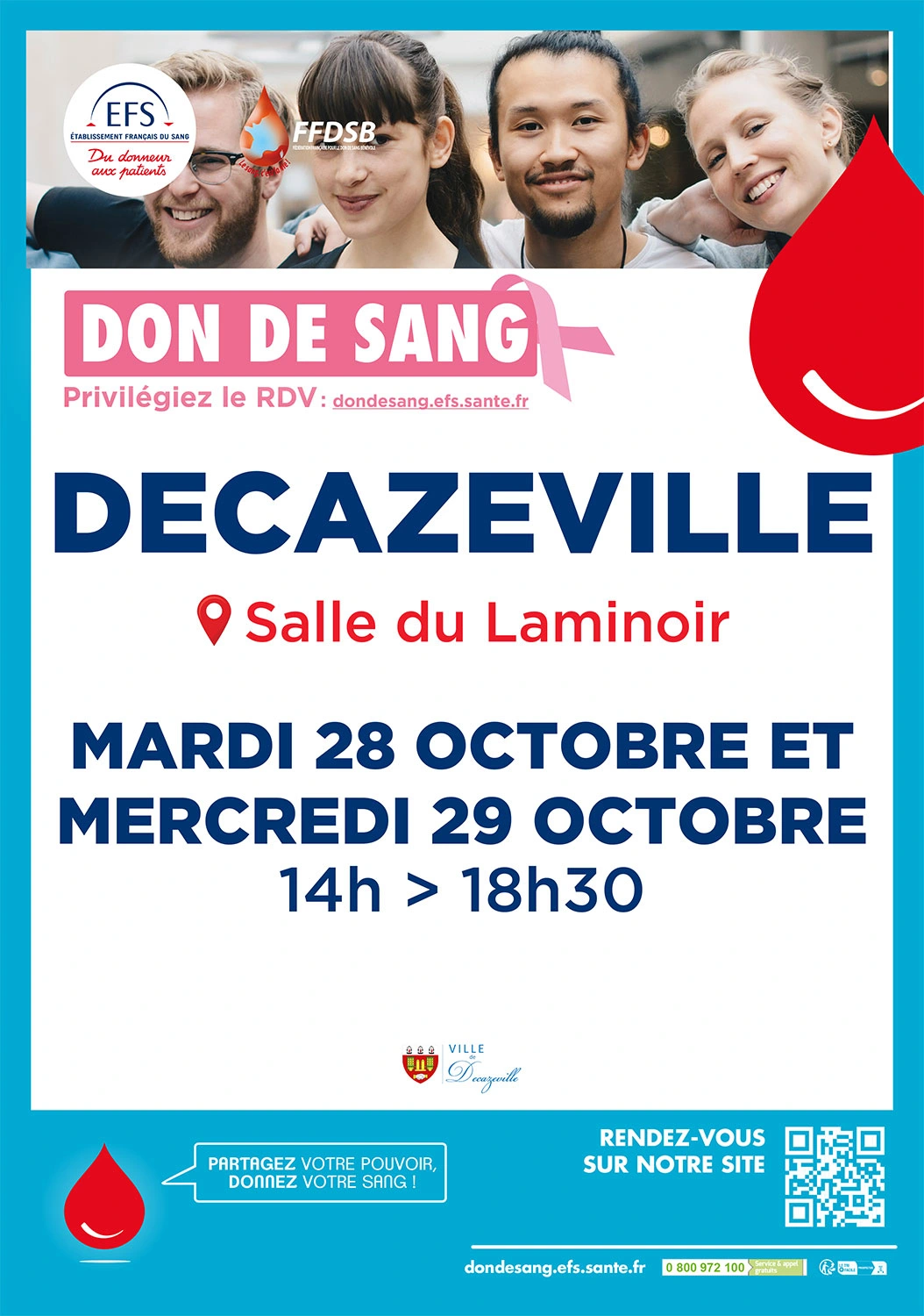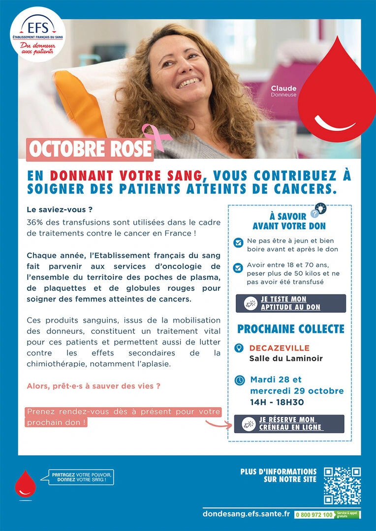 Chaque année, !'Etablissement français du sang fait parvenir aux services d'oncologie de l'ensemble du territoire des poches de plasma, de plaquettes et de globules rouges pour soigner des femmes atteintes de cancers.... L'EFS organise un Don de Sang au Laminoir à Decazeville les 28 & 29 Octobre de 14h à 18h 30. Alors, prêt(e)s à sauver des vies ?