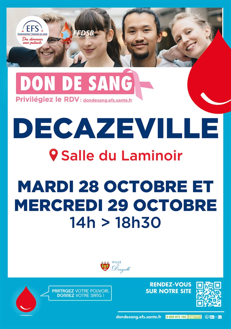 Chaque année, !'Etablissement français du sang fait parvenir aux services d'oncologie de l'ensemble du territoire des poches de plasma, de plaquettes et de globules rouges pour soigner des femmes atteintes de cancers.... L'EFS organise un Don de Sang au Laminoir à Decazeville les 28 & 29 Octobre de 14h à 18h 30. Alors, prêt(e)s à sauver des vies ?