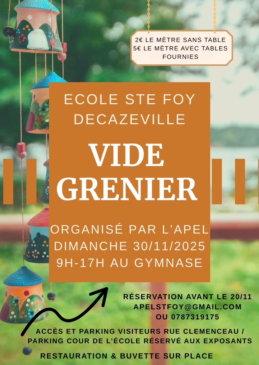L'Apel de l'école Ste-Foy organise un Vide-grenier le dimanche 30 novembre 2025 de 9h à 17h dans le gymnase de l'école. Réservation des stands avant le 20 novembre au : 07.87.31.91.75 ou apelstfoy@gmail.com. Restauration & buvette sur place.